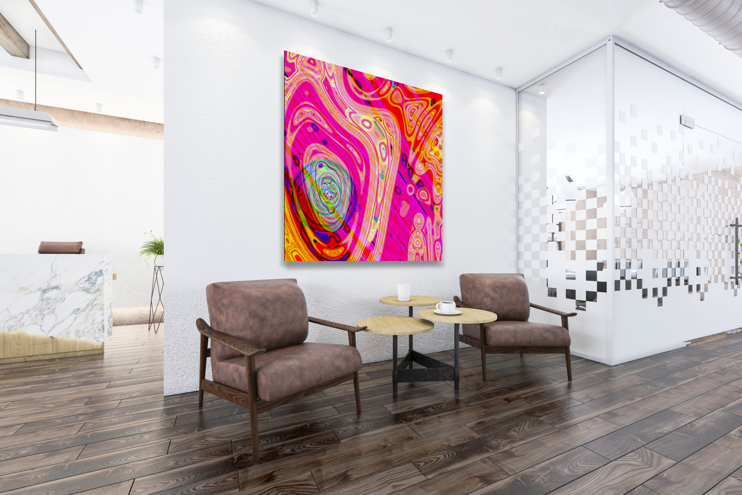Being that my work is digital, I feel like on the surface my process might seem a little blasé (I mean, I sit in front of a computer and press buttons and move a mouse around:)). In actuality, I think it is quite fascinating. I do enjoy sketching with pen and pencil, and that is how my digital art journey began. I scanned some pen and ink drawings and then applied color to them using Adobe Photoshop. With these scanned and colored images, I found that using certain filters and effects I could create more impressionistic pieces as well as abstract ones void of any figurative content. With my early abstract experiments, I discovered that I could zoom into a particular area within a piece, crop it out, enlarge it and then add intricate detail to it to create a new piece. And then I did it again, and again. To date I have created hundreds of new pieces of art using this method of zooming, cropping and enlarging. Essentially I have large pieces that quite literally originated from less than a single pixel of an earlier piece. After trying to print these pieces to canvas and being very disappointed at the loss of detail and vibrancy due to the texture I found Vivid Metal Prints, a company close to me in Lexington, NC, that dye sublimates images to Chromaluxe aluminum panels, and the results were stunning. I’ve been using them ever since for my original work.