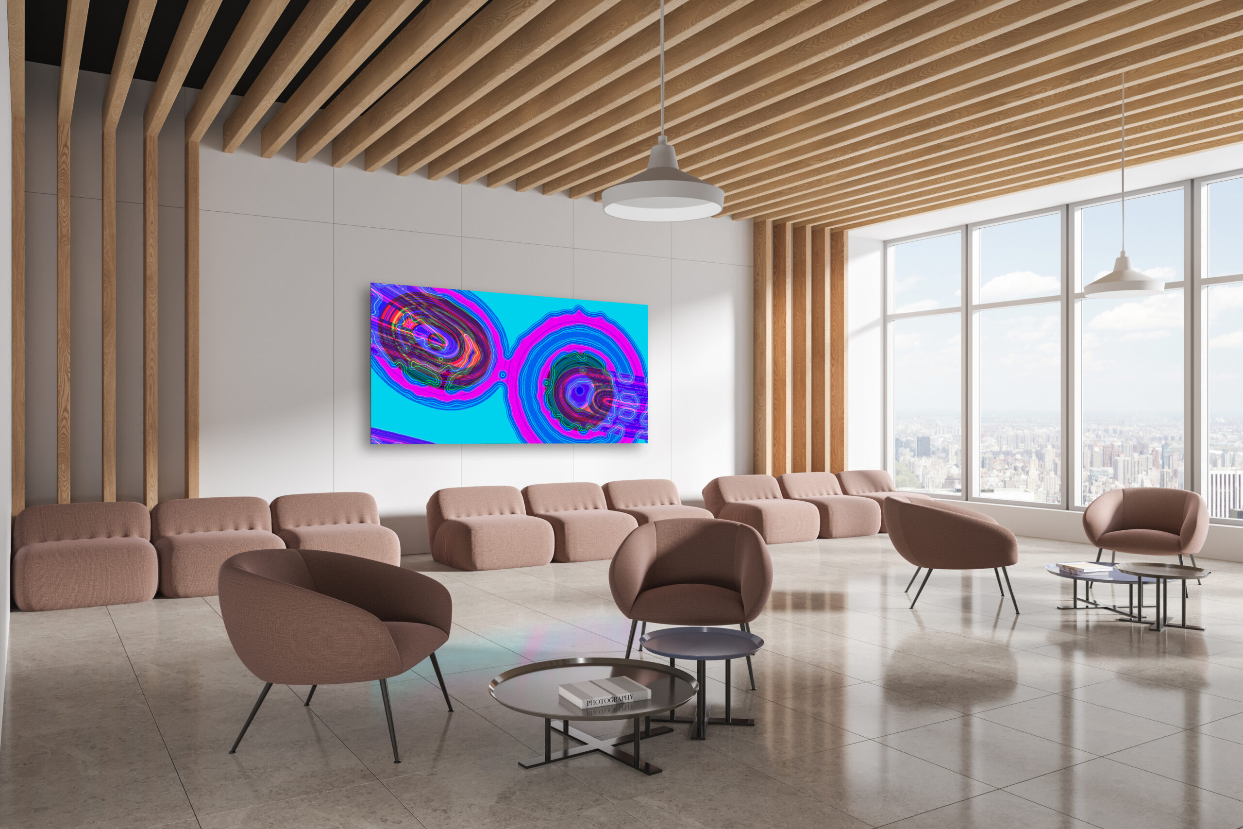 Being that my work is digital, I feel like on the surface my process might seem a little blasé (I mean, I sit in front of a computer and press buttons and move a mouse around:)). In actuality, I think it is quite fascinating. I do enjoy sketching with pen and pencil, and that is how my digital art journey began. I scanned some pen and ink drawings and then applied color to them using Adobe Photoshop. With these scanned and colored images, I found that using certain filters and effects I could create more impressionistic pieces as well as abstract ones void of any figurative content. With my early abstract experiments, I discovered that I could zoom into a particular area within a piece, crop it out, enlarge it and then add intricate detail to it to create a new piece. And then I did it again, and again. To date I have created hundreds of new pieces of art using this method of zooming, cropping and enlarging. Essentially I have large pieces that quite literally originated from less than a single pixel of an earlier piece. After trying to print these pieces to canvas and being very disappointed at the loss of detail and vibrancy due to the texture I found Vivid Metal Prints, a company close to me in Lexington, NC, that dye sublimates images to Chromaluxe aluminum panels, and the results were stunning. I’ve been using them ever since for my original work.