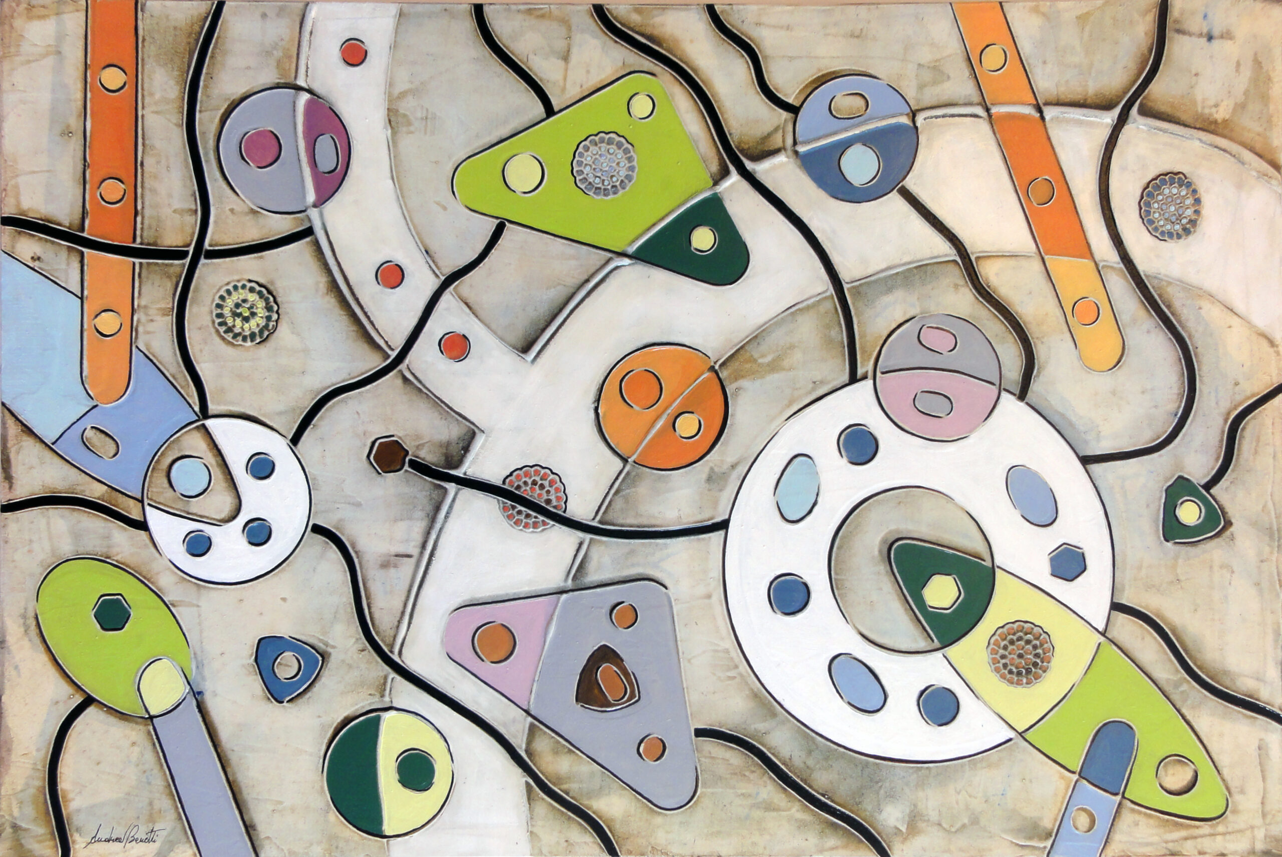 This work of mine, which I created in 2013, is the result of an inner search, which I wanted to represent with this work, which with its bright and gaudy colors, wants to transmit positive energy. Every human being must take a spiritual, inner journey, which can be religious, or only of inner research, to always improve the relationship with oneself. I wanted to represent this journey through the shapes and colors of this work. I created a bas-relief with chalk on the canvas and after having spread turmeric and water pigments with the spatula on the canvas, I intervened on the shapes with oil colors and blocked everything with a very thin layer of resin.